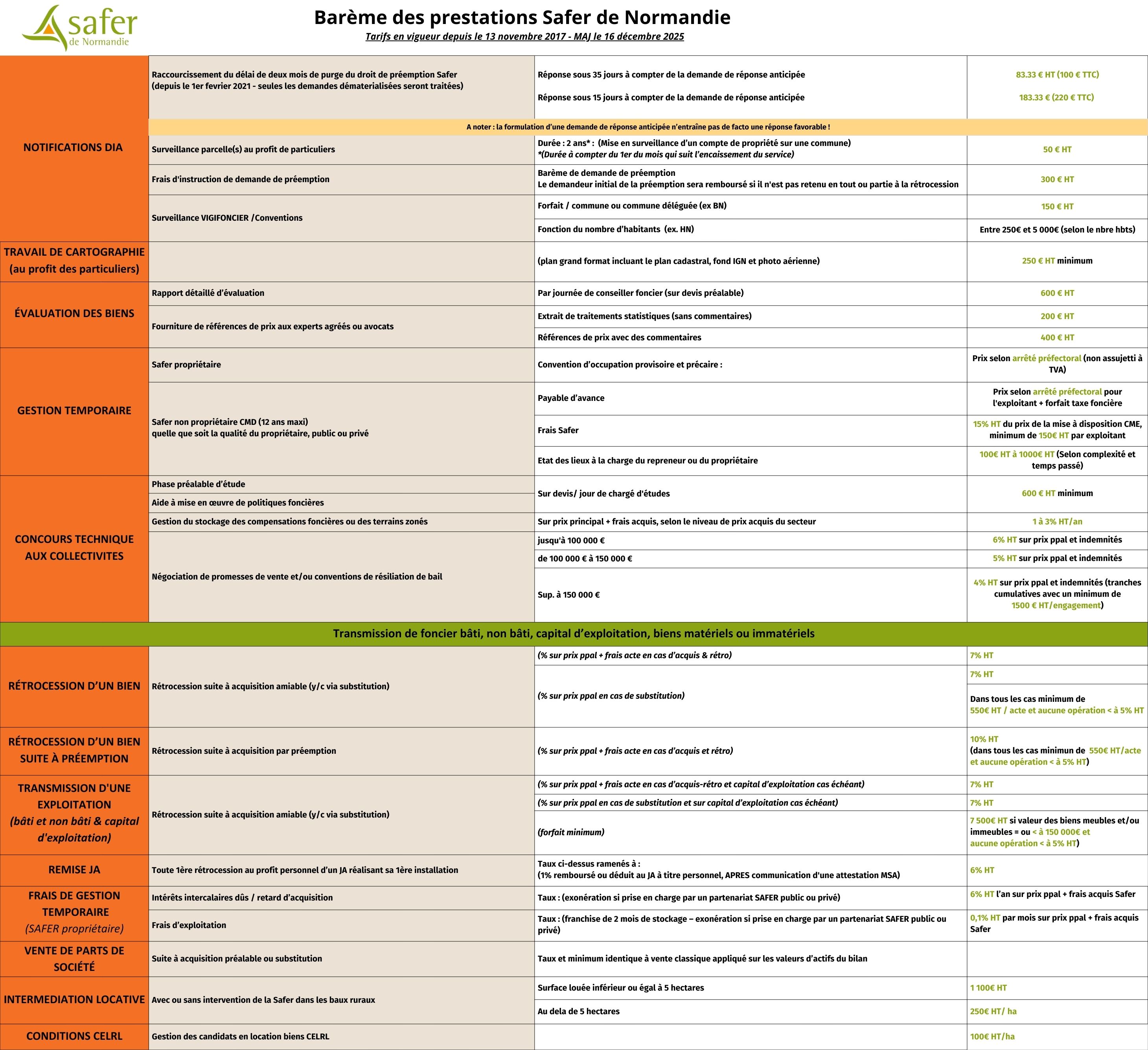Tarif des prestation 2026